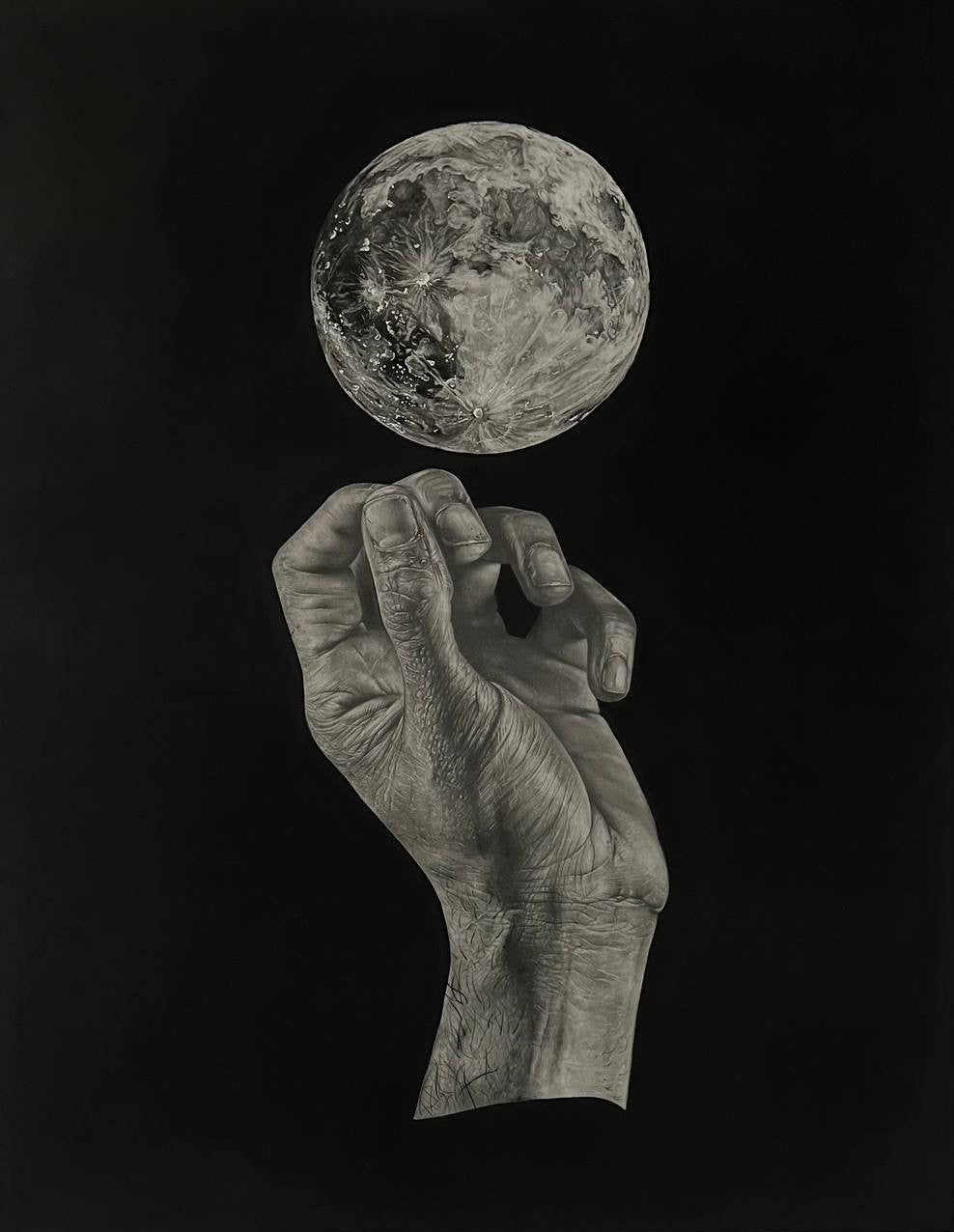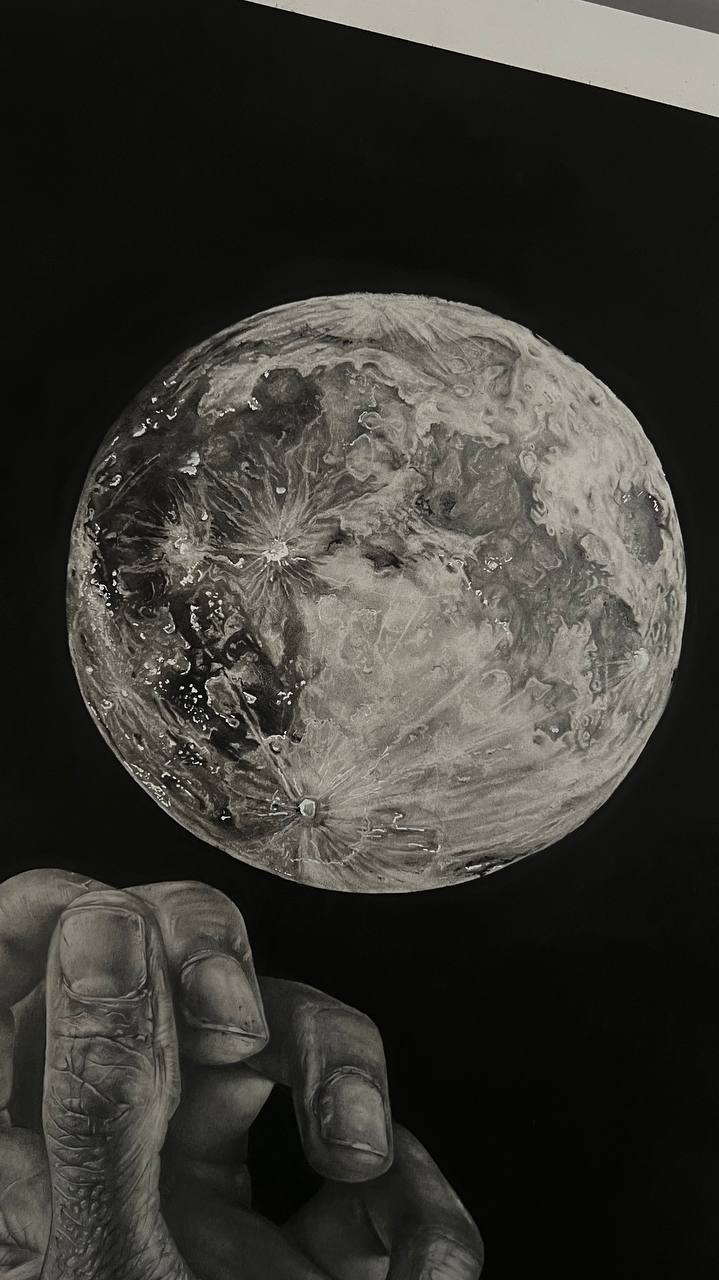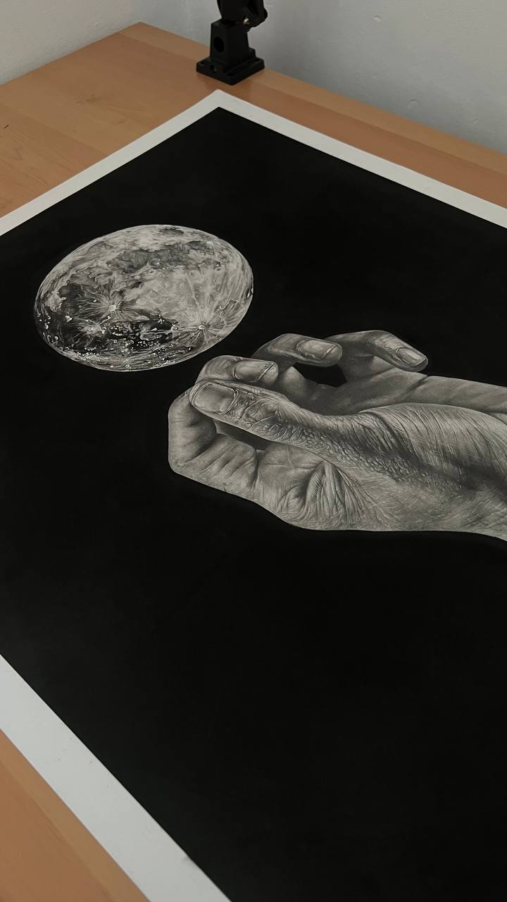 Es la Quinta y ultima obra de una serie de 5 piezas inspiradas en mis gustos y aficiones, tomando como referencia mi propia mano y haciendo el gesto de querer alcanzar la luna, no esta tan lejos como crees, tampoco estamos lejos de nuestros sueños, solamente tenemos que creerlo que ya lo hemos logrado...
