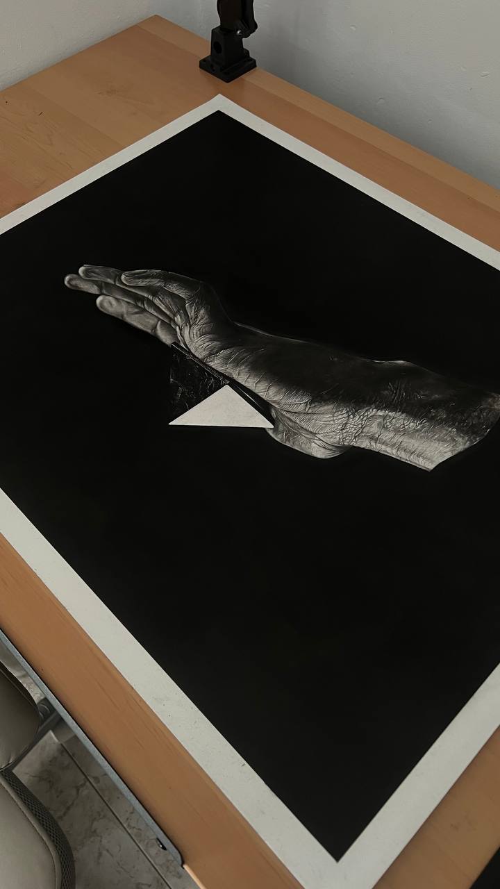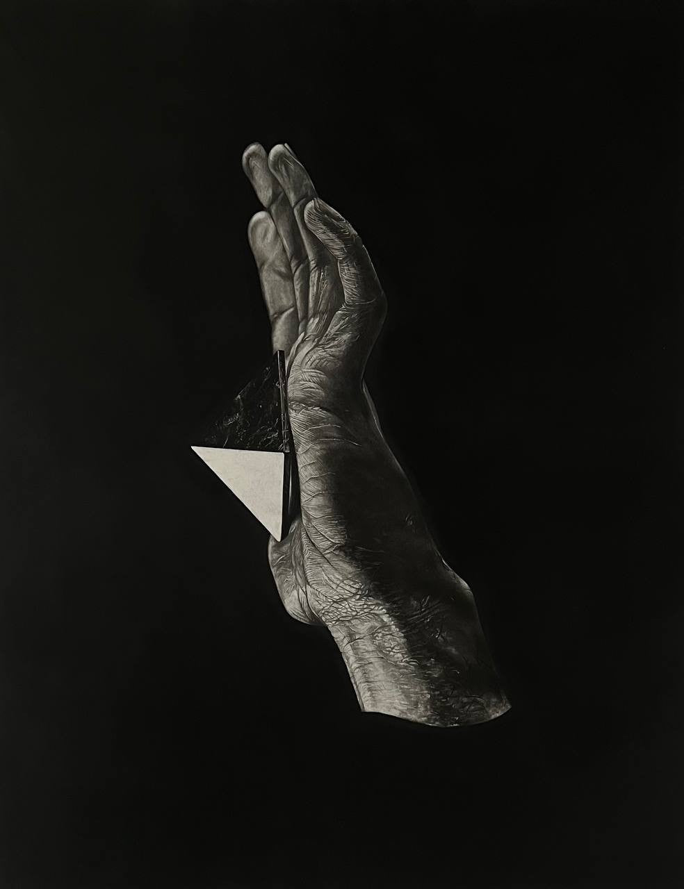 Es la Segunda obra de una serie de 5 piezas inspiradas en mis gustos y aficiones, tomando como referencia mi propia mano y sosteniendo una pirámide en vertical, no hace caso a la gravedad, al tiempo, siempre se mantiene, no cae al vacío, pues así es la "Fe"